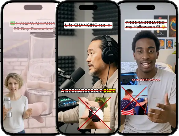 Each package includes three AI Driven UGC Ads — built with our signature asset overlays that dramatically boost engagement and conversions.